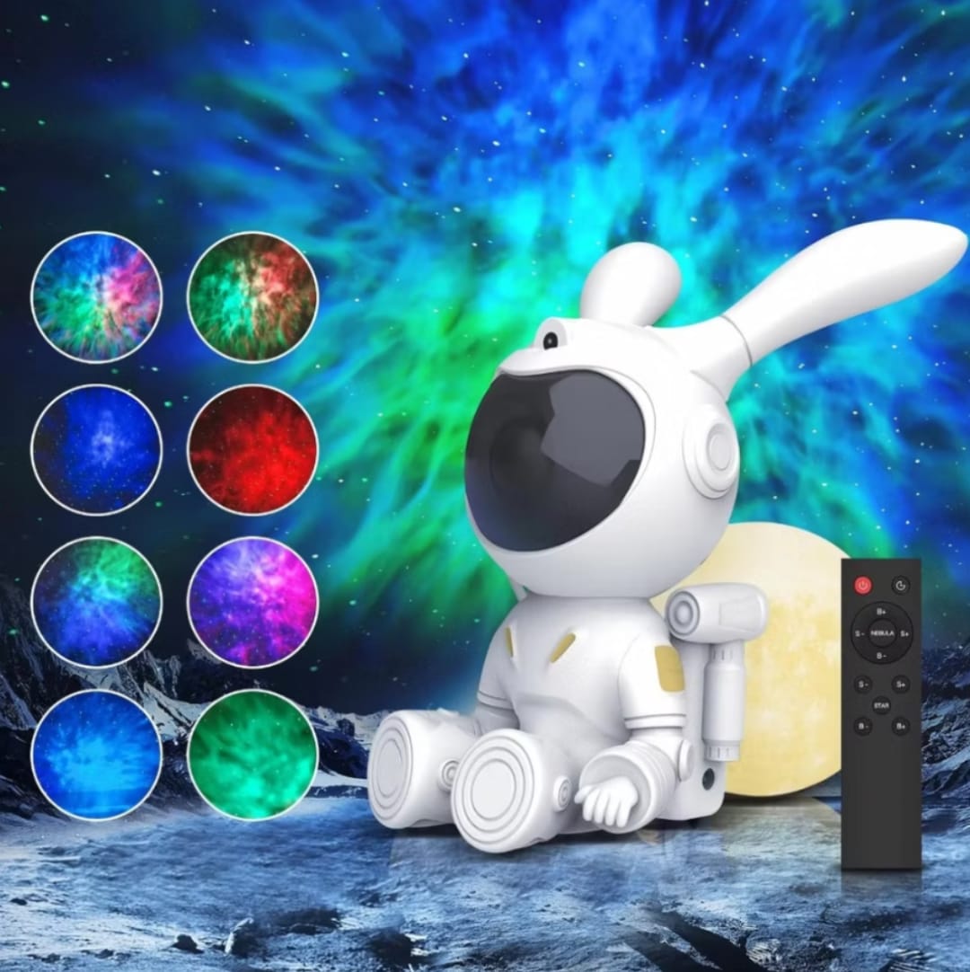 Bonito Coelho Astronauta Design A estrela projetor galáxia luz noturna tem a aparência de um astronauta coelho com braços flexíveis. Um coelho fofo com uma forma de astronauta elegante e bela iluminação de nebulosa, torna seu quarto romântico, elegante e imaginativo.